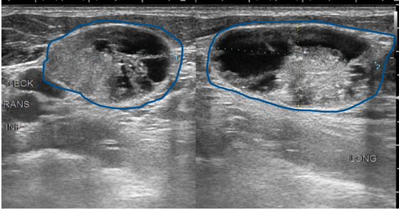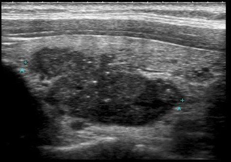 Thyroid ultrasound scans are safe and effective ways to produce images of the thyroid gland. Transverse grey scale sonogram shows a solid ill-defined hypoechoic nodule arrows containing punctate calcification arrowheads in the right lobe of thyroid gland. Thyroid nodules were found in 97 of patients with thyroid cancer and in 56 of without.